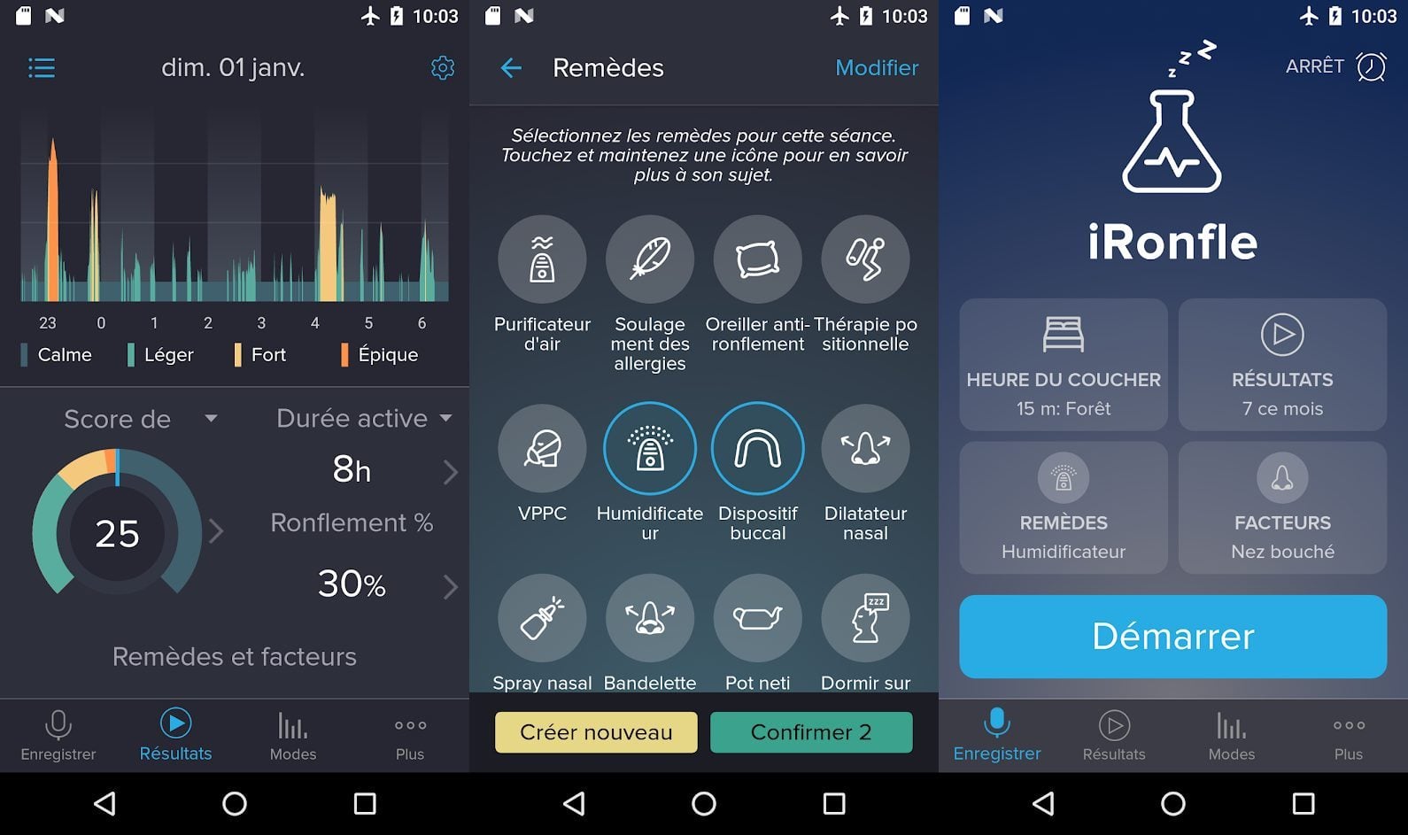 En fonction du type de ronflement relevé, iRonfle suggère plusieurs pistes de résolution du problème. Afin d’en vérifier la pertinence, il est conseillé de le mentionner dans l’appli avant de se coucher. L’évolution des statistiques sur le long terme devrait rapidement confirmer ou non l’efficacité des solutions mises en œuvre.