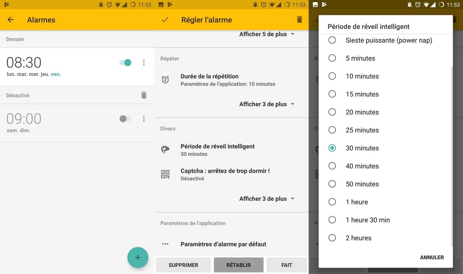 Tout comme Sleep Cycle, Réveil Bonjour calcule une fourchette de trente minutes avant l’heure programmée. Cet intervalle aide l’application à cibler le meilleur moment pour un réveil tout doux, indispensable avant d’attaquer la journée.
