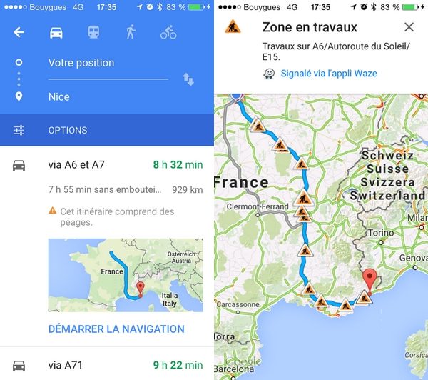 Si vous avez choisi l’option voiture pour partir en vacances, il va vous falloir préparer votre itinéraire. Bien que les GPS soient très pratiques, il est plus prudent d’élaborer une stratégie de repli en regardant avant le départ les différents itinéraires qui s’offrent à vous si vous ne voulez pas rester coincé dans un bouchon sur l’autoroute. ViaMichelin et Mappy, dont la réputation n’est plus à faire, calculent pour vous les meilleurs itinéraires possibles en fonction de vos préférences (favoriser les autoroutes ou non, etc.), tout en indiquant une estimation du coût du trajet (péages, consommation, type de carburant). Autre option à considérer pour simuler des itinéraires, Google Maps. L’application a l’avantage de profiter des cartes de Google, des POI et des avis d’utilisateurs, mais permet aussi de se transformer en un véritable GPS avec navigation, guidage vocal, et même alertes trafic signalées par les utilisateurs de Waze.
