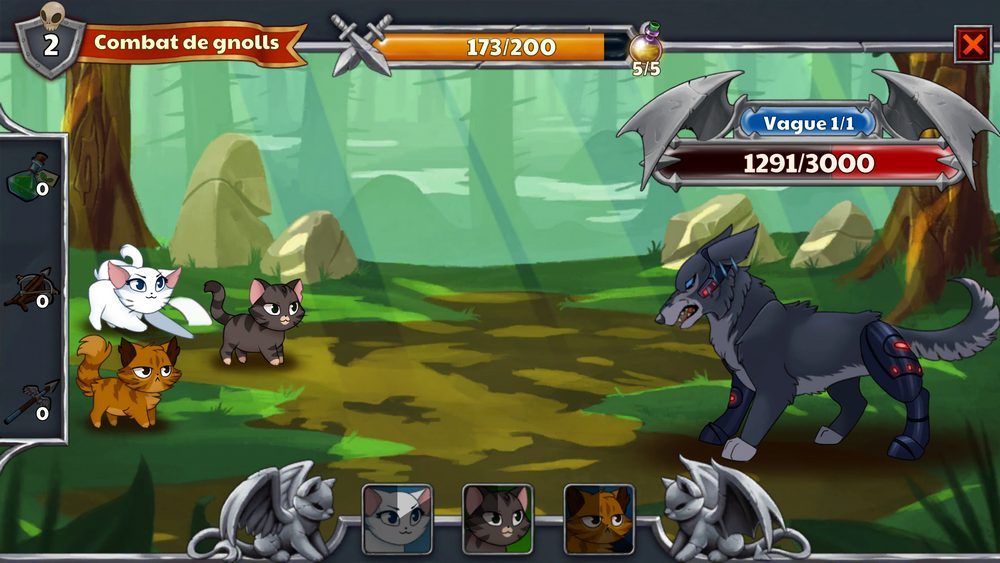 La plus grande originalité de Castle Cats réside très certainement dans l’automatisation de ses quêtes. Après avoir sélectionné les héros aptes à triompher, vous avez le choix de laisser tourner les combats en arrière-plan ou d’y participer manuellement. De la sorte, que vous soyez effectivement présent ou non derrière votre écran, votre guilde poursuit son entraînement et sa progression affranchie des temps morts liés à votre éventuelle absence.