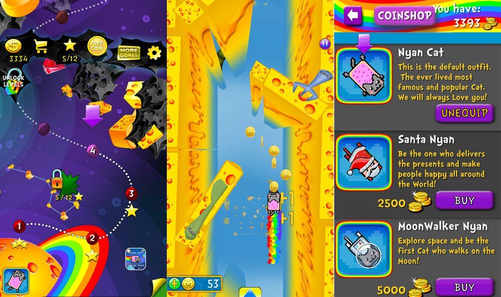 À la manière du gif animé, le Nyan Cat déroule son arc-en-ciel dans ce titre à défilement vertical. Le parcours semé d’embûches donne du fil à retordre aux joueurs les moins habiles qui se doivent d’aiguiser leurs réflexes pour espérer progresser. La bande-son inchangée ravive les souvenirs d’une époque refoulée où l’on se plaisait à subir dix heures de Nyan Cat non-stop sur Youtube.