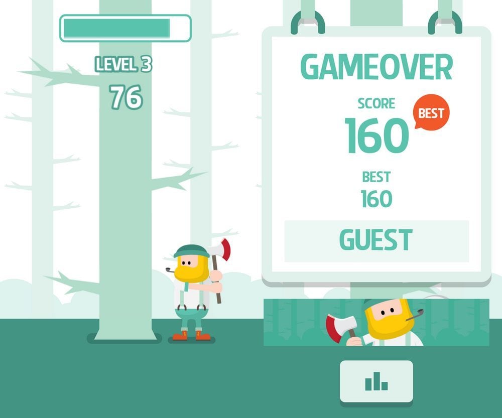 Gauche, droite, droite, droite, gauche, droite, 250k Timberman se joue de vos réflexes alors que vos pouces frôlent dangereusement la crise de spasmes à force de tapoter l’écran. Une jauge de temps diminue alors que vous ralentissez la cadence, vous contraignant à faire danser vos doigts le plus rapidement possible pour allonger votre temps de jeu.