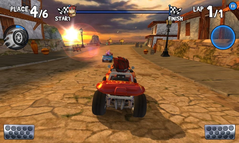 On apprécie chez Beach Buggy Racing la possibilité de sélectionner le système de contrôles qui convient le mieux à sa façon de jouer. Traditionnellement, les commandes tactiles font preuve d’une sensibilité satisfaisante pour qui veut conduire avec précision. Les adeptes de l’immersion poussée trouvent leur bonheur grâce au support de l’accéléromètre qui transforme leur appareil mobile en volant de kart. Dans les deux cas, Beach Buggy Racing tire pleinement profit du support tactile sur lequel il tourne. Ajoutons à cela une bonne compatibilité avec les technologies actuelles parant les latences et offrant une belle qualité d’image, et l’on obtient l’un des meilleurs Mario Kart like mobiles.