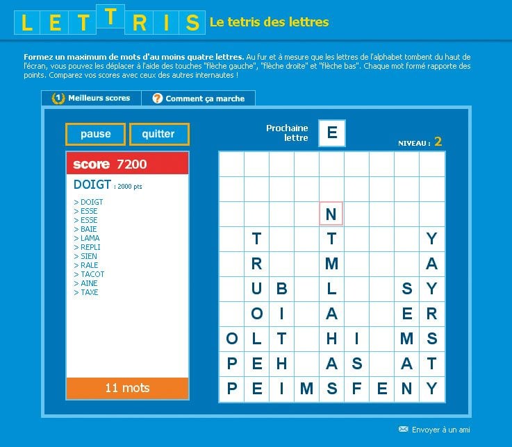 Ce jeu est tout bonnement diabolique : il mélange le concept de Tetris et celui du Scrabble. Plus précisément, il faut orienter des lettres qui tombent du plafond afin de former des mots de quatre lettres au minimum. Pour que la partie ne s’arrête pas, les lettres qui s’entassent ne doivent pas atteindre le plafond. La vitesse rend la tâche de plus en plus difficile et le côté aléatoire des lettres tirées ruine, en général, vos meilleures prévisions. On fait vite abstraction du graphisme plutôt froid et dépouillé tellement c’est captivant…