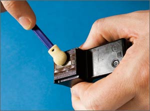 Prenez en main la cartouche ou le dispositif qui maintient les têtes d’impression en faisant attention à ne pas toucher les circuits imprimés. Trempez un bâtonnet à embout en mousse dans de l’eau déminéralisée, ou une solution de