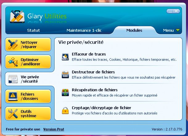 Cette suite a pour but de remettre sur pied votre système. Elle propose toutes sortes d’outils pour optimiser votre mémoire vive, nettoyer votre disque ou encore réparer votre base de registre. Elle possède une fonction maintenance en un clic qui permet, à tout néophyte, de mettre son ordinateur en ordre de marche sans avoir à bidouiller. Les amateurs de réglages fins un tant soit peu connaisseurs ne resteront pas sur leur faim, vu le grand nombre d’options offertes. Un programme indispensable.