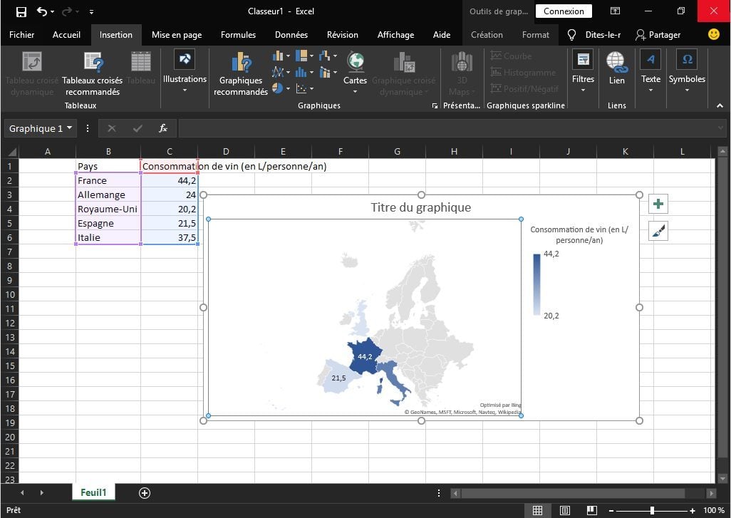 Le tableur de Microsoft inaugure deux nouveaux types de graphiques. Le premier permet de créer une carte en 2D pour comparer des valeurs dans des régions géographiques.