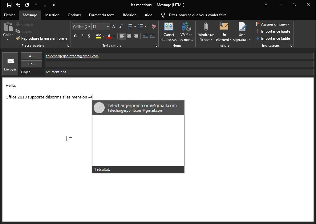 Outlook va alors rechercher dans votre carnet d’adresses le contact à mentionner, et va l’ajouter automatiquement à la liste des destinataires du message.