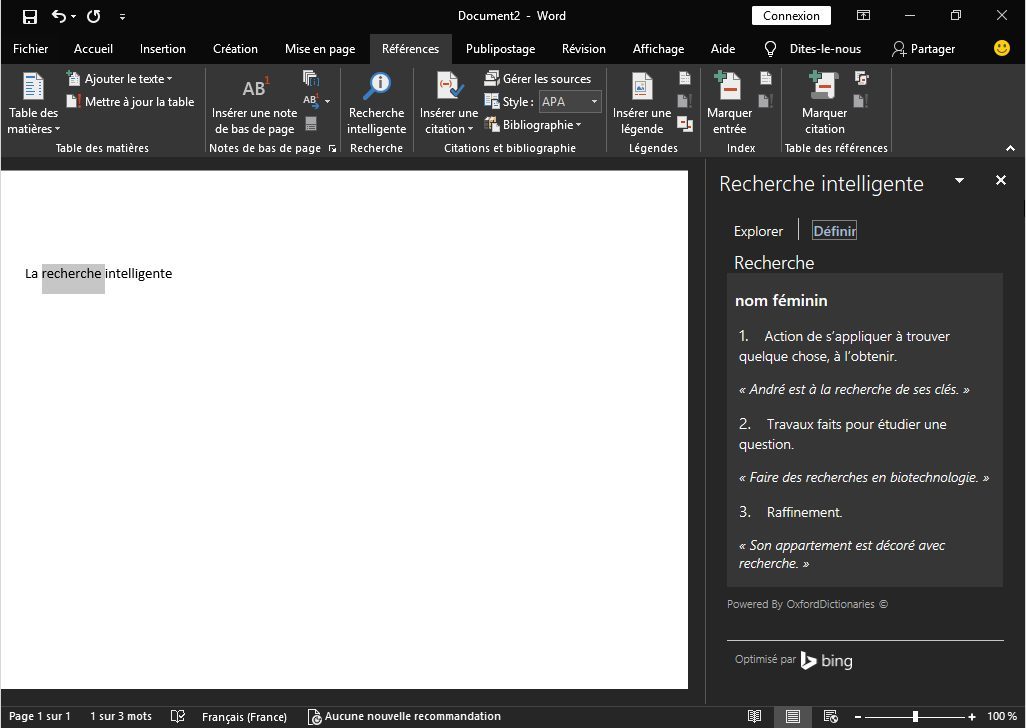 La fonction Recherche intelligente, accessible dans la majorité des programmes de la suite évolue. S’il était déjà possible de chercher sur Bing un mot contenu dans un document, la Recherche intelligente intègre désormais un onglet Définir proposant d’afficher la définition des mots et les différentes significations possibles.