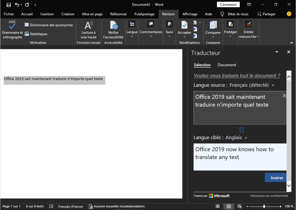 Office sait désormais traduire vos écrits. Qu’il s’agisse d’une sélection de texte ou d’un document entier, Office 2019 affiche dans un volet la traduction du texte que vous lui soumettez. L’utilisateur peut modifier la sélection de texte à traduire, mais aussi modifier la langue cible.