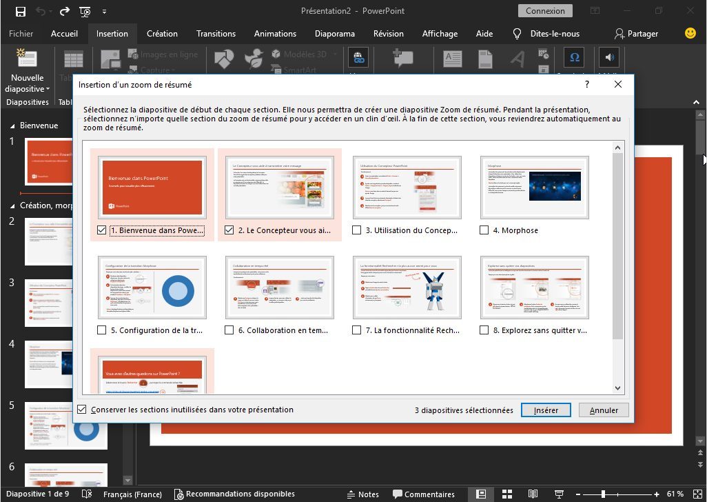L’outil de présentation de Microsoft profite d’une nouvelle fonctionnalité permettant de créer facilement des index à plusieurs échelles. En début d’une présentation, par exemple, la fonction zoom vous permet de créer une table des matières visuelle en sélectionnant les premières diapositives de chacune de vos parties.
