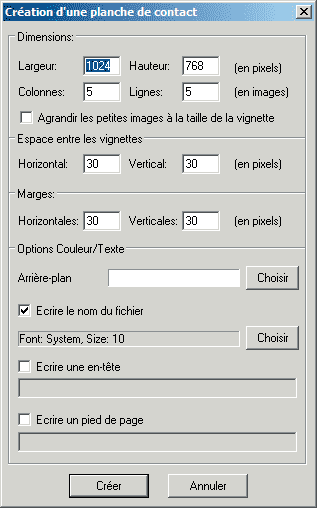 souris, et choisissez Créer une planche de contact avec les vignettes sélectionnées. Une boîte de dialogue s’affiche à l’écran afin de définir comment se présentera cette planche.