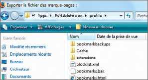 PortableFirefox. Ouvrez le sous-dossier Profile et collez le fichier Bookmarks.html à cet emplacement. Avec Internet Explorer, la procédure est la suivante : cliquez sur Fichier, Importer et