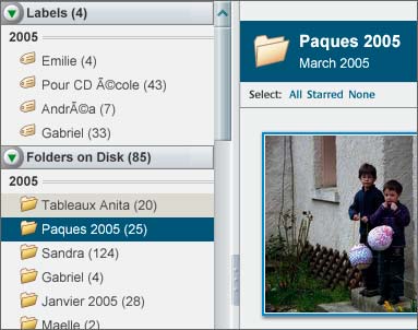 triés par ordre chronologique de création. Cette présentation est indépendante de la hiérarchie en dossiers et sous-dossiers de votre disque dur, ce qui est déconcertant. Cliquez sur un dossier du volet de gauche de Picasa pour que le logiciel
