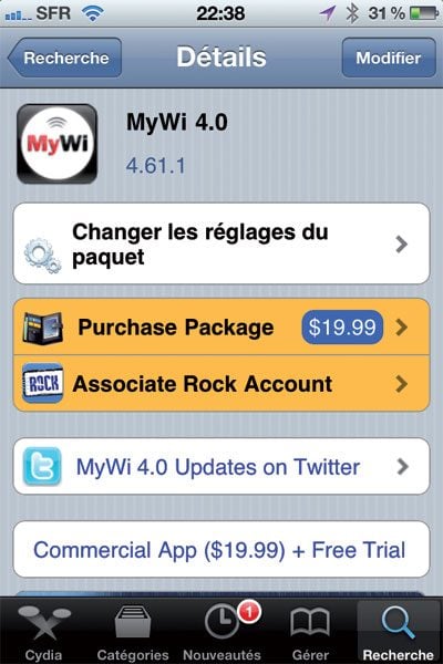 Sur votre iPhone jailbreaké, lancez l’application Cydia. Cliquez sur Rechercher puis saisissez MyWi. Cliquez sur MyWi 4.0 puis sur Installer. Une fois l’installation terminée, cliquez sur le bouton Relancer le springboard. Vous pouvez quitter Cydia. Lancez MyWi et acceptez les messages d’informations.
