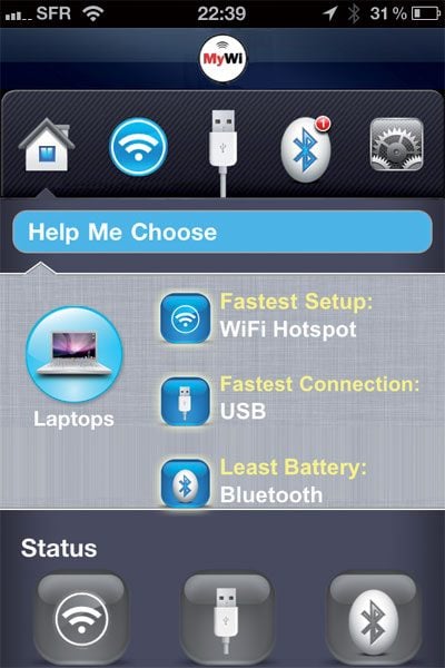 Trois modes de connexion sont proposés : par USB, par Bluetooth ou par Wi-Fi. Le mode USB nécessite l’utilisation du câble USB et n’est intéressant que pour les ordinateurs portables. Le mode Bluetooth ne fonctionne qu’avec les autres produits les Apple (iPod touch ou iPad). Le mode Wi-Fi, s’il est le plus gourmand en énergie électrique, reste sans aucun sans doute le plus simple d’utilisation et est totalement universel. Il va créer un réseau Wi-Fi classique, visible n’importe quelle machine.