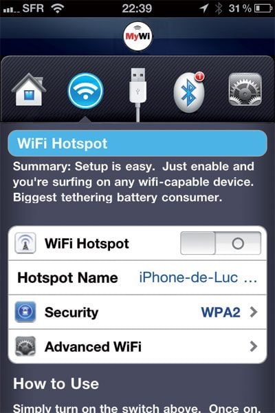 La zone Advanced Wifi permet, entre autres, de régler la force du signal (si vous avez besoin d’éloigner fortement votre iPhone de votre autre machine). Il ne vous reste plus qu’à activer le hot spot en faisant glisser le bouton WiFiHotspot vers la position I. Une barre bleue s’affiche en haut Une s’affiche de l’écran, indiquant que le hot spot fonctionne. Par ailleurs, si vous cliquez sur Maison, vous constaterez que l’icône Wi-Fi située en bas à gauche est activée. Pour désactiver le hot spot (ou pour le réactiver), il vous suffit désormais de cliquer sur cette icône.