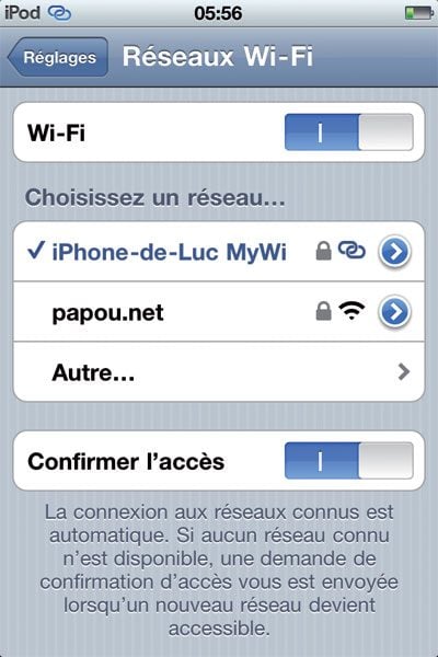 Aucune installation n’est nécessaire sur votre tablette (iPad ou Android) ou sur votre iPod touch : il vous suffit en effet d’activer sur celle-ci le réseau Wi-Fi et de vous connecter sur le hot spot précédemment créé. Ainsi, sur iPad/iPod touch, cliquez sur Réglages, Wi-Fi puis choisissez le réseau iPhone-de-XXX MyWi. Notez que l’icône, en haut à gauche, prend la forme de carrés imbriqués et non de l’icône classique Wi-Fi.