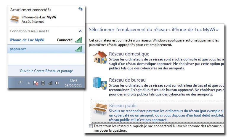 Nous supposerons que votre ordinateur est sous Windows 7, les manipulations étant facilement adaptables sur une autre version de Windows. Assurez-vous que le Wi-Fi est activé (il faut parfois déplacer un bouton-poussoir sur le portable ou taper une combinaison de touches, l’activation du Wi-Fi se manifestant généralement par l’allumage d’une Led bleue). Cliquez sur l’icône Wifi en bas à droite. Sélectionnez le réseau iPhone-de-XXX MyWi et saisissez le mot de passe WPA2.