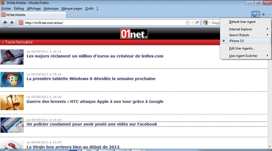 Chaque navigateur (Firefox, Internet Explorer, Safari…) indique au site Web la plate-forme que vous utilisez. Cette indication est appelée le User Agent. Cette opération, assez compliquée à réaliser avec Internet Explorer, est beaucoup plus simple avec Firefox. C’est donc ce dernier navigateur que vous utiliserez. Lancez Firefox, et ouvrez la page des modules (add-on) et cliquez sur Télécharger maintenant. Installez le complément et redémarrez Firefox puis installez User Agent Switcher dans une barre d’outils.