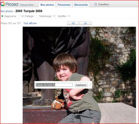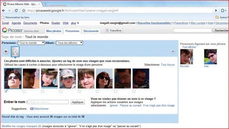8- Picasaweb offre maintenant la possibilité de taguer les photos, c’est-à-dire de les marquer. Le site repère en effet tous les visages sur vos clichés et propose de nommer les personnages. Sur votre page