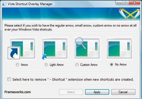 Manager. Dans la fenêtre du programme, cochez l’option No Arrow pour supprimer la flèche, l’option Arrow pour la restaurer ou l’option Light Arrow pour en réduire la taille. Cliquez sur le bouton