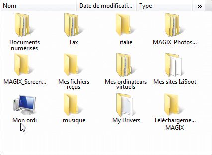 Ordinateur. Avec notre exemple, cela donne : Mon ordi. {20D04FE0-3AEA-1069-A2D8-08002B30309D}. Résultat, le dossier système Ordinateur est accessible par son icône dans le dossier que vous avez choisi. La