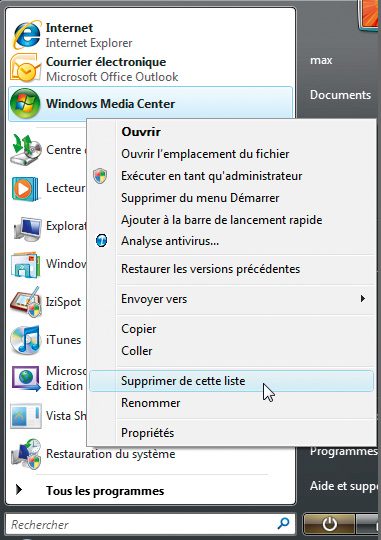 dans le menu Démarrer sur l’icône d’un programme et cliquez, dans le menu contextuel, sur Ajouter au menu Démarrer. La commande qui lance ce programme est copiée dans la zone supérieure du menu Démarrer. Pour