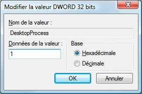 Déroulez alors le menu Edition, Nouveau, Valeur DWORD 32 bits. Donnez à la nouvelle clé le nom DesktopProcess. Double-cliquez ensuite sur son nom et attribuez-lui la valeur 1. Redémarrez Windows.