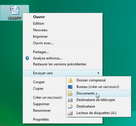 Lorsque vous faites un clic droit de la souris sur l’icône d’un fichier ou d’un dossier, vous trouvez, entre autres, une commande Envoyer vers qui propose différentes destinations (unités de disques, clés USB,