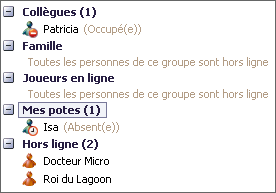 Groupes.Vos contacts s’affichent en dehors des groupes créés par défaut.Remarque : avec les versions antérieures de MSN, vos contacts étaient automatiquement ajoutés dans le groupe Autres contacts.Etape 2Pour déplacer un contact dans un groupe, cliquez dessus. Maintenez le bouton de la souris enfoncé et glissez-déposez votre contact dans le groupe de votre choix :