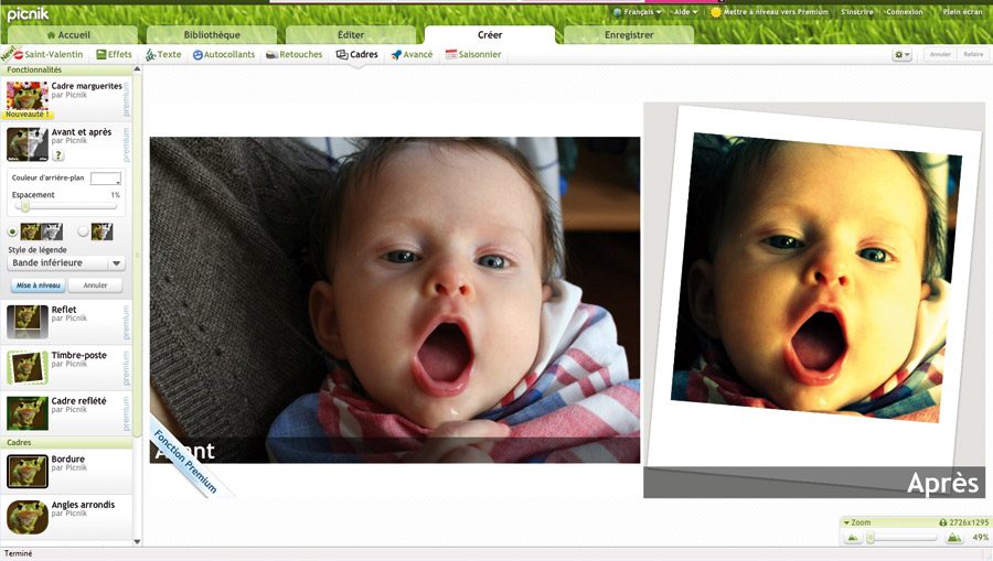 La retouche photos ludique et accessible à tous, sans même passer par l’étape fastidieuse de la création de compte, c’est ce que propose Picnik. Adieu paysages penchés, photos sous-exposées, mal cadrées ou floues. Exit les yeux rouges. Picnik permet aussi bien la retouche « sérieuse » que la création façon scrapbooking. Rien ne vous empêche donc, dans l’espace Création, de coller des autocollants en forme de hérisson, d’ajouter des cadres avec des petits cœurs. Mais aussi des décors de saison au moment des fêtes, que l’on trouve dans la rubrique Saisonnier. Ou de donner bonne mine à vos personnages.