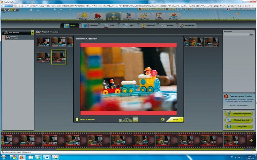 Kizoa combine diaporamas et fonctions de retouche photos. Le site recèle de nombreux effets et filtres, avec une nette coloration fun. Ici, on agrémente les clichés de petits cœurs, on déforme les visages, on ajoute des cadres bizarroïdes… Les diaporamas s’animent, eux, avec toute une panoplie d’effets, de transitions. On peut même y ajouter textes et musiques.