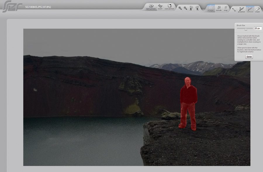 Rsizr est bien plus qu’un simple outil de recadrage de photos. Avec ce logiciel, vous pourrez par exemple effacer de vos clichés numériques un (ou une) ex, comme s’il (ou elle) n’avait jamais existé, en lui indiquant ce qui doit disparaître. Ensuite, Rsizr s’occupe de tout !