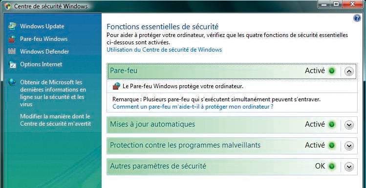 Le pare-feu de Windows a l’avantage d’être configuré correctement dès le lancement de votre micro. Il convient juste de s’assurer qu’il est bien activé. C’est très simple : cliquez sur Démarrer, puis sur Panneau de configuration, dans la fenêtre qui s’ouvre, cliquez sur Centre de sécurité puis sur Pare-feu Windows.