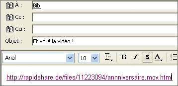 liens. Suivez, au choix, le mode d’emploi Stocker une vidéo sur un espace Web ou Stocker une vidéo sur RapidShare.Le premier vous fournit un lien plus simple à utiliser pour ceux qui recevront le mail (il leur suffira de cliquer). RapidShare, lui, est mieux adapté aux grosses vidéos (jusquà 100 Mo !), et il offre une bonne vitesse