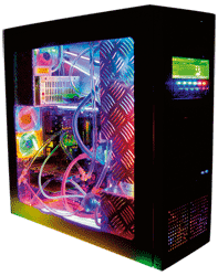 C’est dans le noir qu’on mesure le mieux le travail accompli par Frish. Pas moins de 14 néons, 6 ventilateurs lumineux, 1 stroboscope, 1 laser et 4 pieds lumineux équipent ce PC. Pour gérer cet équipement, il