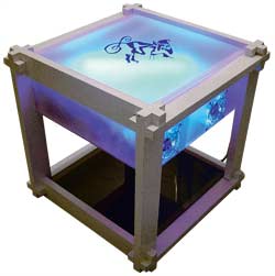 été l’achat d’une plaque de Plexiglas pour remplacer le dessus de la table et une partie des côtés. Pour cacher les composants, le Plexiglas a subi un ponçage au papier de verre très fin, peaufiné à la laine de verre. Et pour renforcer l’aspect