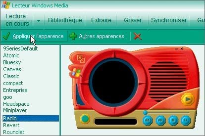 de gauche, choisissez un motif, par exemple Radio, puis cliquez sur Appliquer l’apparence, en haut à gauche de l’écran. Quelle que soit l’apparence retenue, vous retrouverez toujours les boutons de contrôle des plages
