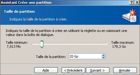 partition que vous allez modifier et cliquez sur Suivant. Indiquez la taille de la partition à créer en déplaçant le curseur ou en saisissant la capacité dans le champ Taille de la partition et validez par