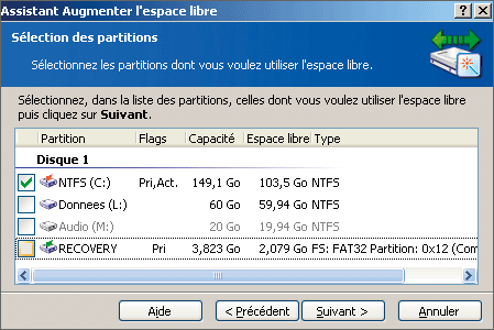 la partition dont vous souhaitez ponctionner l’espace de stockage et validez par Suivant.