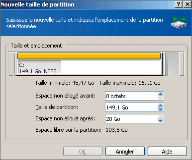 Espace non alloué avant, si l’espace libre est localisé avant la partition cible), cliquez une fois sur la flèche dirigée vers le bas ; en effet, l’espace disque qui sera rattaché à la partition doit être légèrement inférieur à