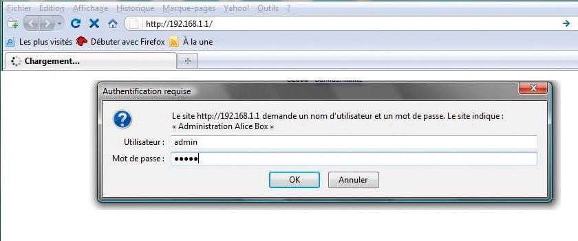 Vous obtenez une suite de quatre chiffres séparés par des points, de forme 192.168.X.Y. Entrez-la dans la Barre d’adresses de votre navigateur Internet, sans les www, et appuyez sur la touche Entrée. Un identifiant et un mot de passe vous sont demandés, par défaut il s’agit souvent de « admin » et « admin ». Vous les trouverez dans la documentation de votre matériel ou dans celle de votre fournisseur d’accès à Internet à moins que, prévoyant, vous les ayez déjà changés.