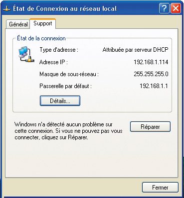 Ouvrez le Panneau de Configuration, puis cliquez sur Centre réseau et partage. Double-cliquez ensuite sur Voir le statut, au bout de la ligne Connexion au réseau local. Dans la fenêtre Etat de connexion au réseau local, cliquez sur le bouton Détails.