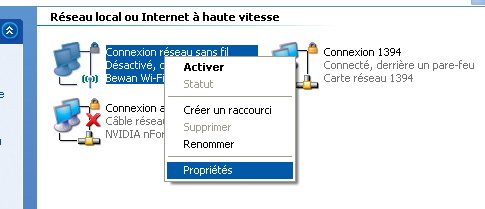 Ouvrez le menu Démarrer, cliquez sur Panneau de configuration, puis sur Connexion réseau et à l’intérieur de la fenêtre qui s’ouvre, faites un clic droit sur Connexion réseau sans fil puis, dans le menu déroulant, cliquez à gauche sur Propriétés.