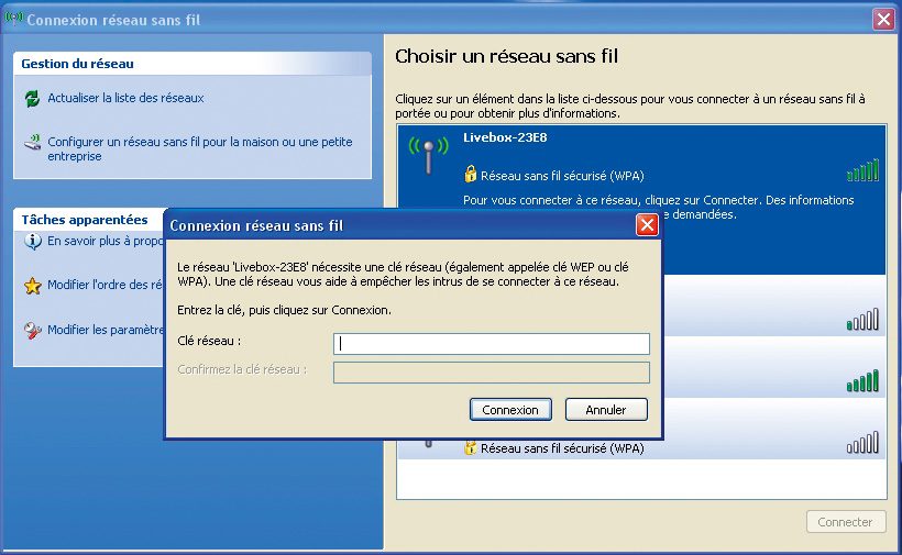 Ouvrez le Panneau de configuration et cliquez sur Centre réseau et partage. Cliquez ensuite dans le volet de gauche sur Gérer les connexions réseau, puis sur Connexion au réseau sans fil. Vista vous propose les différents réseaux disponibles 6. Cliquez sur celui qui correspond à votre matériel, puis sur Connexion et entrez votre clé réseau dans le cartouche qui s’affiche. Fermez toutes les fenêtres