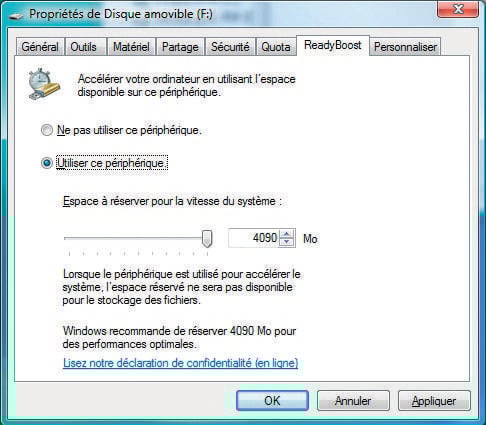 2- Retirez votre clé puis réintroduisez-la dans un des ports USB du PC. Dans la fenêtre qui s’affiche, cliquez sur l’option ReadyBoost. Dans la nouvelle fenêtre, sélectionnez l’onglet ReadyBoost et cochez l’option Utiliser ce périphérique. A la section Espace à réserver pour la vitesse du système, placez le curseur complètement à droite pour réserver le maximum d’espace sur la clé. Cliquez enfin sur OK.