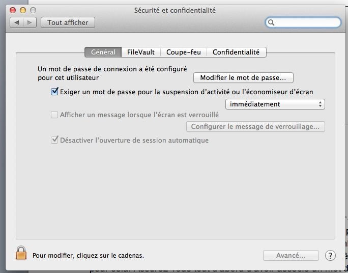 Assurez-vous tout d’abord d’avoir associé un mot de passe à votre compte utilisateur. Ouvrez les Préférences Système et cliquez sur Utilisateurs et groupes. Définissez votre mot de passe si ce n’est déjà fait. Cliquez ensuite sur le bouton Tout afficher en haut à gauche de la fenêtre. Cliquez sur Sécurité et confidentialité et cochez la case Exiger un mot de passe pour la suspension d’activité ou l’économiseur d’écran.