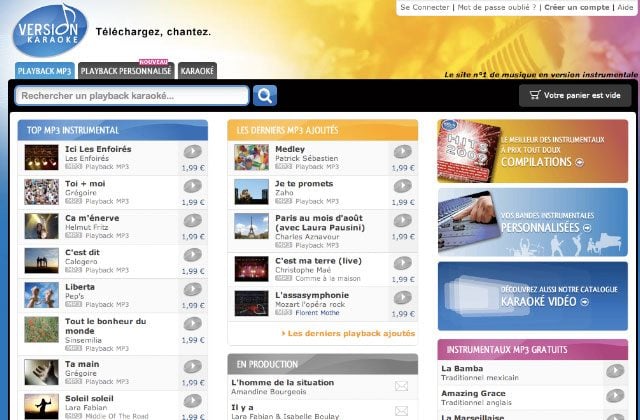 Version Karaoké vaut le détour par la diversité de son offre, mélangeant variété récente, grands classiques des karaokés (comme Aux Champs Elysées, de Joe Dassin) et morceaux gratuits car passés dans le folklore traditionnel (comptine, hymnes nationaux, etc.). Le catalogue propose au choix des fichiers audio, à 1,99 euro, avec la piste instrumentale seule, les instruments et les chœurs, avec un chanteur comme guide vocal. Ou bien des fichiers vidéo à 2,49 euros, où comme dans un vrai karaoké, les paroles sont soulignées au fur et à mesure de la progression de la chanson. Les morceaux sont aux formats MP3 (encodé en 192 kbps) et WMV lisibles par tous les PC sans logiciel à installer. Le site fournit même un lien vers des logiciels de karaoké gratuits pour Linux et pour Mac.