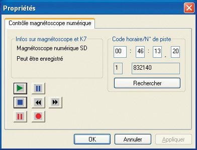 Une nouvelle fenêtre nommée Propriétés s’affiche.Vous y retrouvez les boutons de commandes classiques d’un magnétoscope (lecture, avance et retour rapide, etc. ) mais également une fonction de recherche pour localiser une scène à l’aide de son code temporel (le fameux